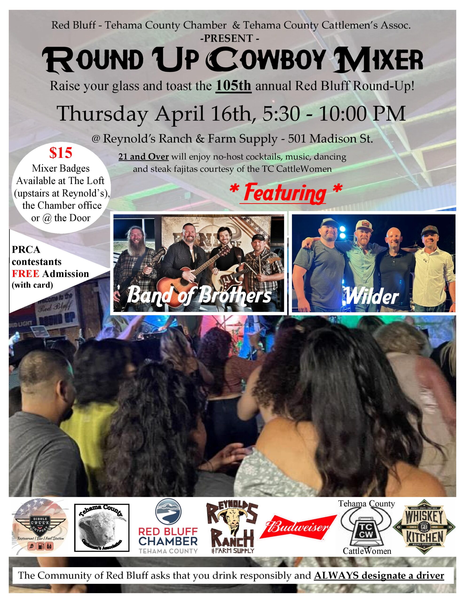 Come enjoy the Party of the Round-Up, sponsored by the Chamber and the Cattle­men, on April 16th from 5:30 to 10:00 PM.
