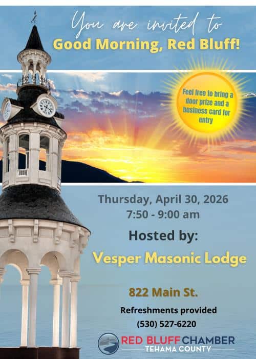 Calling all Red Bluff, Tehama County, NorCal Businesses. Join us for the most amazing networking event, Good Morning, Red Bluff, hosted by Vesper Masonic Lodge!