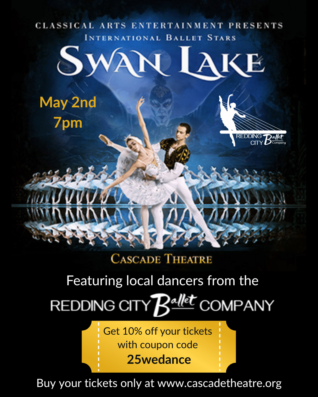 Redding City Ballet is thrilled to partner with Classical Arts Entertainment and International Ballet Stars to present a breathtaking performance of Swan Lake on Saturday, May 2nd at 7:00 PM at the Cascade Theatre.