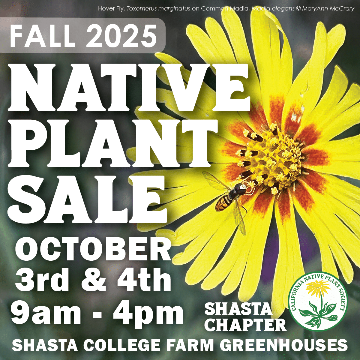 The Shasta Chapter of the California Native Plant Society will offer a Fall Native Plant Sale at the Shasta College Farm, from 9 AM to 4 PM on Friday and Saturday, October 3rd and 4th. Fall is the best time to plant natives for birds and pollinators.
